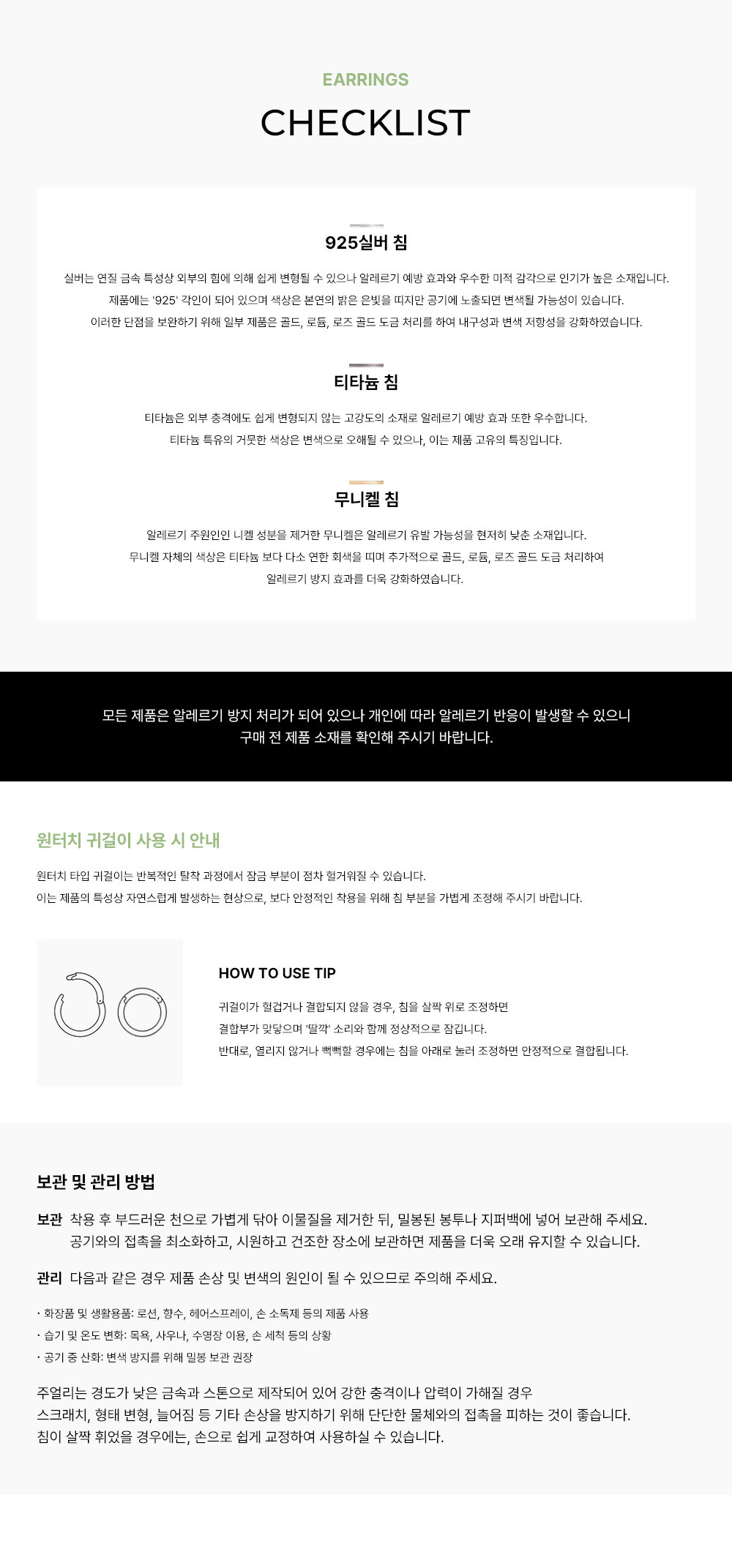 | 착용시 주의사항 | 제품은 물기가 없는 상태로 비닐팩에 보관하시길 권장합니다. 수분, 염분, 향수 등은 제품 변색의 주원인이므로 사용 시 주의 바랍니다. 착용 후 부드러운 천으로 닦고 보관하시기 바랍니다. 컬러 코팅된 제품은 스크래치 방지를 위해 개별 보관해주세요. 침이 살짝 휘었을 경우 손 쉽게 교정이 가능합니다. 착용 후에는 아래의 방식으로 각 오염 부분을 닦아낸 후 밀봉된 봉투나 지퍼백 등에 담아 공기와의 접촉을 최소화한 후 시원하고 건조한 장소에 보관해주시기 바랍니다. *코팅 부분은 이물질이 뭍었을 경우 물티슈로 가볍게 닦아주세요 *도금된 부분은 부드러운 마른천으로 닦아서 공기 차단이 잘되는 곳에 밀봉 보관해주시기 바랍니다. *색번짐이 있는 옷에 닿지 않도록 주의해주시기 바랍니다. |